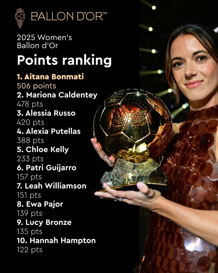 28分优势! 女足金球奖得分: 邦马蒂506分 卡尔登泰478分 鲁索420